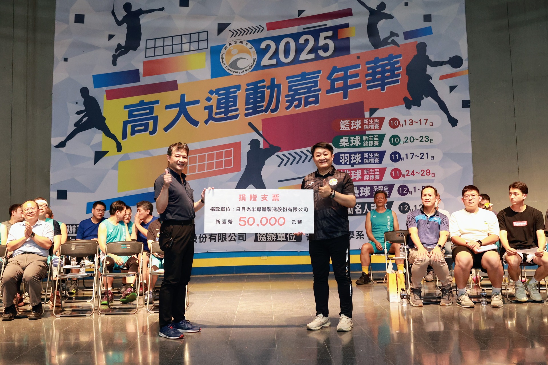 國立高雄大學「2025高大運動嘉年華」於13日晚間盛大開幕,活動為期兩個月,賽程涵蓋籃球、桌球、羽球、排球與慢速壘球等五大項目,吸引全校師生熱情參與。今年特別邀請日月光半導體製造股份有限公司設計工程處處長丁一權率隊出席,並代表企業捐贈新臺幣五萬元支持活動,展現產學共榮的合作情誼。開幕當晚氣氛熱烈,教職員籃球社與日月光籃球社的友誼賽率先登場,象徵學界與產業的互動與交流。