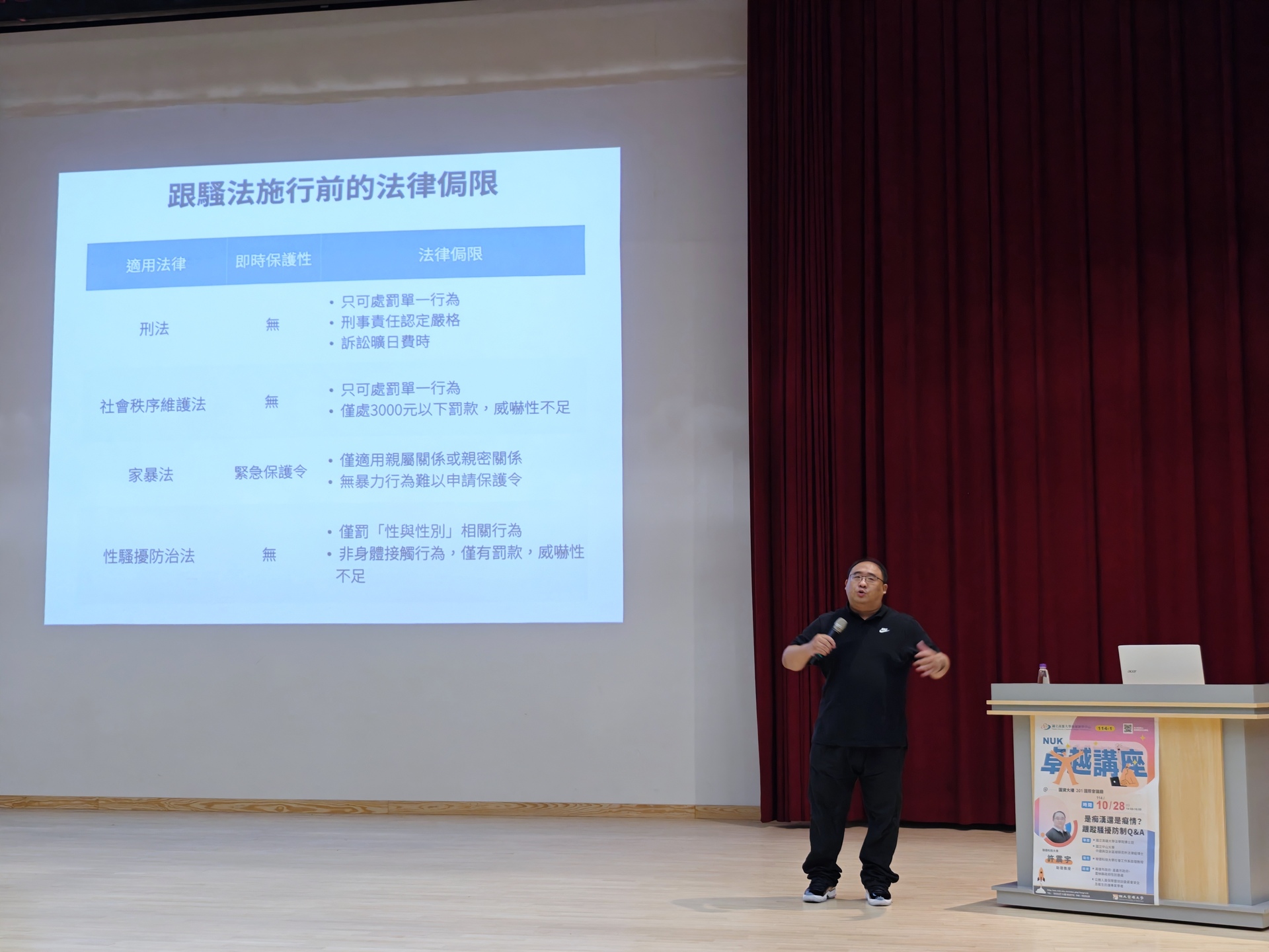 國立高雄大學推廣教育中心於 28 日舉辦《卓越講座》,邀請樹德科技大學助理教授、同時也是高雄大學法律學系第一屆校友的許震宇,以「是痴漢還是癡情?──從人我界線談跟蹤騷擾防制法及家暴防治」為題,分享法制觀念與案例分析。